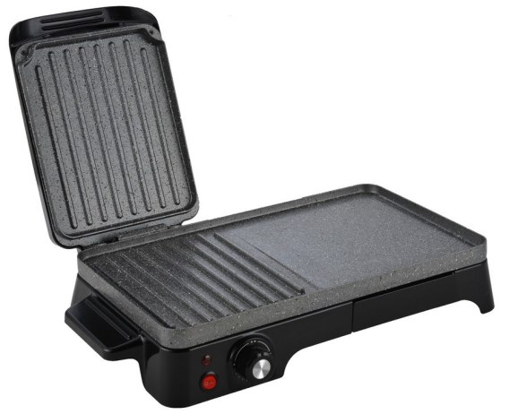 Grill 2 w 1 z funkcją grilla prasowego. Demontowalna tacka na olej. Wskaźnik mocy.