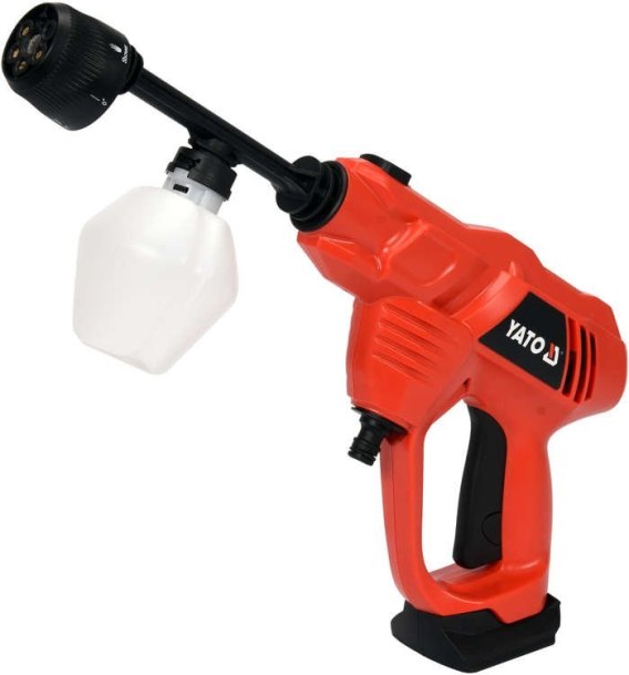 Myjka akumulatorowa 18 V wyposażona w rewolwerową dyszę w komplecie oraz pianownicę. Dzięki funkcji zasysania płynu może pracować jako urządzenie do podlewania ogrodu, mycia ubłoconego roweru itp. wodą z wiadra lub rzeki. Końcówka ma złączkę typu bagnetowego (bayonet), która jest najbardziej popularnym rozwiązaniem na rynku i jest kompatybilna z akcesoriami innych producentów myjek ciśnieniowych.