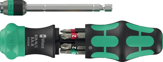 Rękojeść Kraftform z magazynkiem zintegrowanym w rękojeści na 6 bitów z trzpieniem teleskopowym do bitów 1/4". Drobnozębna grzechotka zintegrowana z rękojeścią zapewnia szybką pracę. Intuicyjna zmiana kierunku pracy: obrót pierścienia przełączającego w prawo powoduje zmianę kierunku pracy w prawo, obrót pierścienia przełączającego w lewo powoduje zmianę kierunku pracy w lewo. Mechanizm zapadkowy można zablokować w pozycji 0 dla zapewnienia precyzyjnej pracy. Chowany w rękojeści teleskopowy trzpień z uchwytem szybkowymiennym Rapidaptor umożliwia szybkie dokręcanie nawet w ograniczonych przestrzeniach, gdy trzpień jest schowany. Trzpień można wysunąć przy pomocy tulei blokującej. Narzędzie może być teraz stosowane w funkcji wkrętaka. Trzpień teleskopowy można wyjąć i zastosować jako adapter do elektronarzędzi, jak również ustawić go z powrotem w pierwotnej pozycji. Technologia Rapidaptor uchwytu do bitów zapewnia szybką wymianę narzędzia. Zestaw zawiera 6 bitów 6 BiTorsion charakteryzujących się długą żywotno