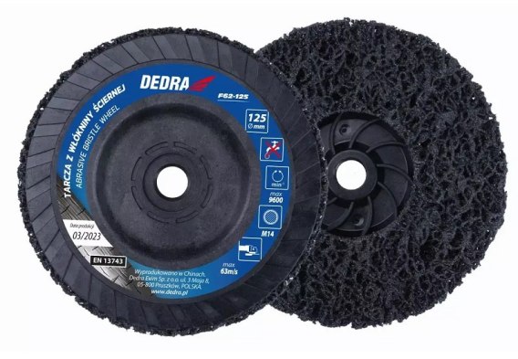 Tarcza z włókniny ściernej DEDRA F62-125 wykonana z włókna nylonowego pokrytego węglikiem krzemu to niezawodne narzędzie przeznaczone do montażu na szlifierce kątowej.