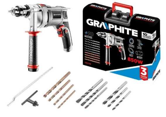 Uniwersalna wiertarka udarowa GRAPHITE o mocy 850 W, doskonale poradzi sobie z materiałami, takimi jak drewno, tworzywa sztuczne, metal czy ceramika.