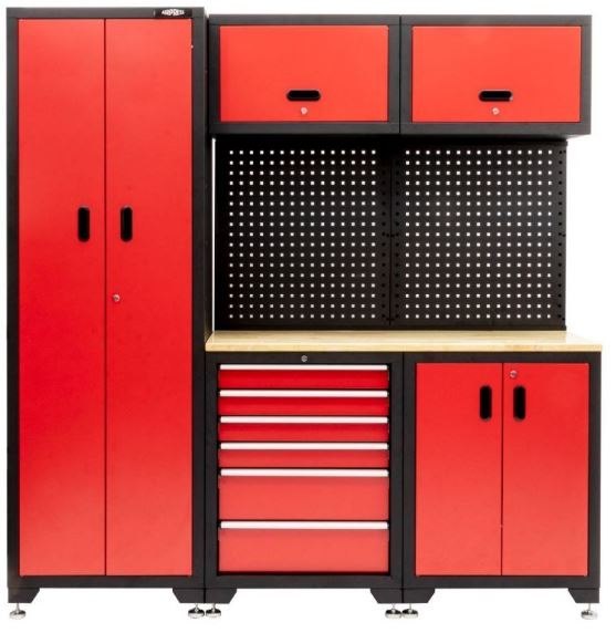 W skład zestawu wchodzi duża szafka boczna z otwieranymi drzwiczkami, dolna szafka z sześcioma szufladami np. na narzędzia, dwie górne szafki, mała szafka oraz tylna ściana, na której dodatkowo można zawiesić dowolne narzędzia na haczykach.